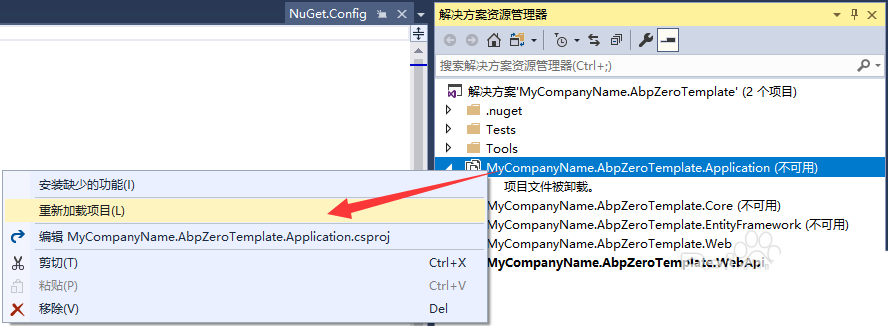 1、在“不可用”的資源上點擊右鍵,選擇“重新加載項目”。這時,VS就會重新讀取資源,修正錯誤的資源引用。然后,人為依次將各個“不可用”資源修正。