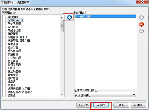 7、接下來要選擇一下本地化所需要用到的語言,比如我們要漢化程序,即選擇簡體中文,然后點擊上面的藍色箭頭,將此語言移動到選定語言欄中。然后再選擇程序的原始語言,就在右下角的選擇設置中;