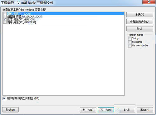 5、 在本地化的資源類型選擇項中,我們可以選擇一些最主要的對象進行漢化,當然也可以點擊全選按鈕,將所有的程序的資源類型全部打開;