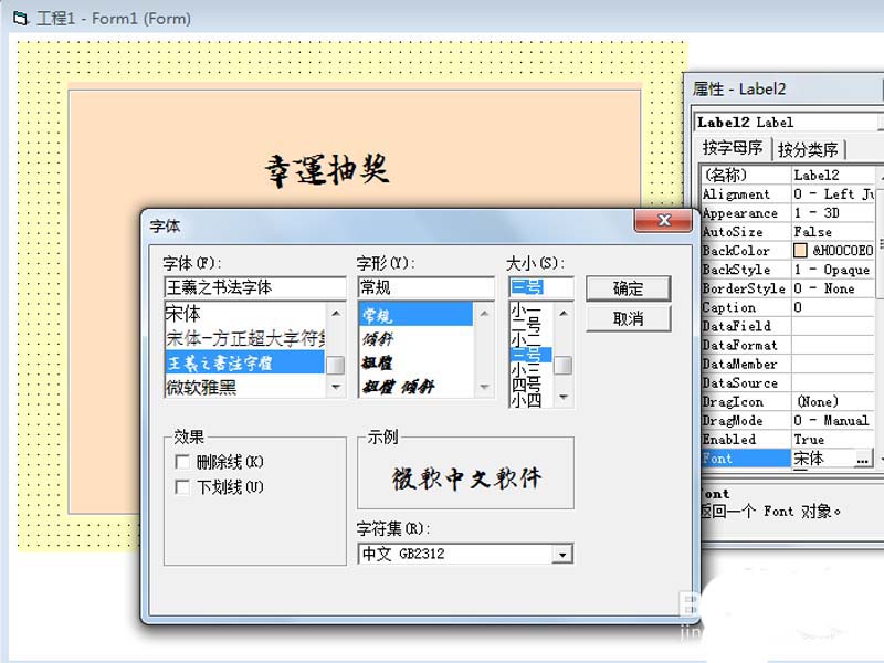 6、分別選擇label1和label2,修改其font屬性,打開字體對話框選擇字體為王羲之書法字體,字形為常規,字號為三號,點擊確定按鈕。