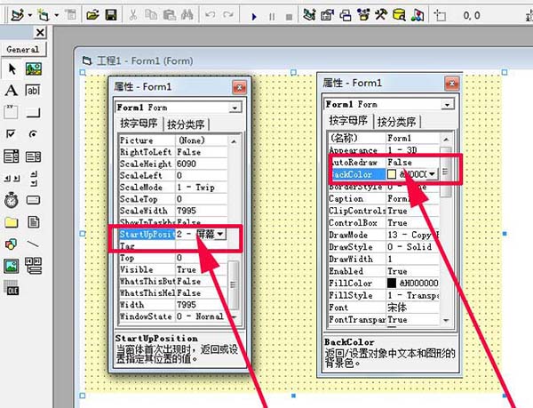 3、選擇窗體,在其右邊的屬性中找到boderstyle屬性,設置屬性值為none,接著再找到startupposition屬性,修改屬性值為2-屏幕中心,再次修改backcolor屬性值為淡黃色。