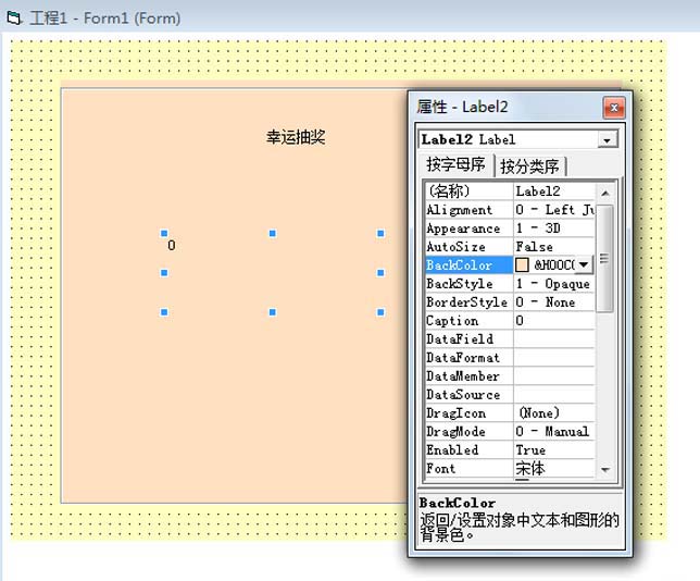 5、在工具箱里雙擊標簽控件兩次,在frame1中顯示兩個標簽控件,修改lable1的caption屬性名稱為“幸運抽獎”,修改label2的caption屬性為“0”,同時修改這兩個標簽控件的backcolor屬性為粉色,和frame控件保持一致。
