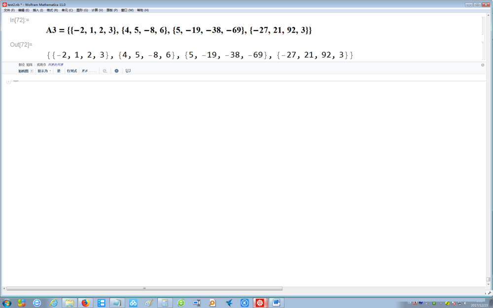5、定義一個4階矩陣:在Mathematica的命令行中,輸入A3={{-2,1,2,3},{4,5,-8,6},{5,-19,-38,-69},{-27,21,92,3}},然后按Enter+Shift