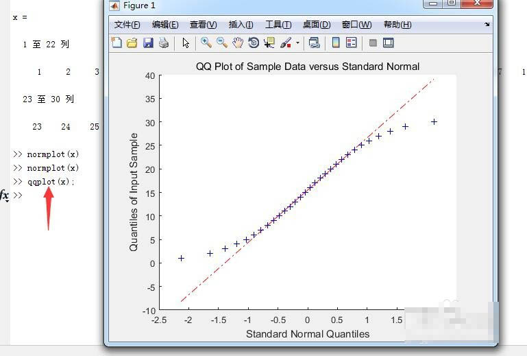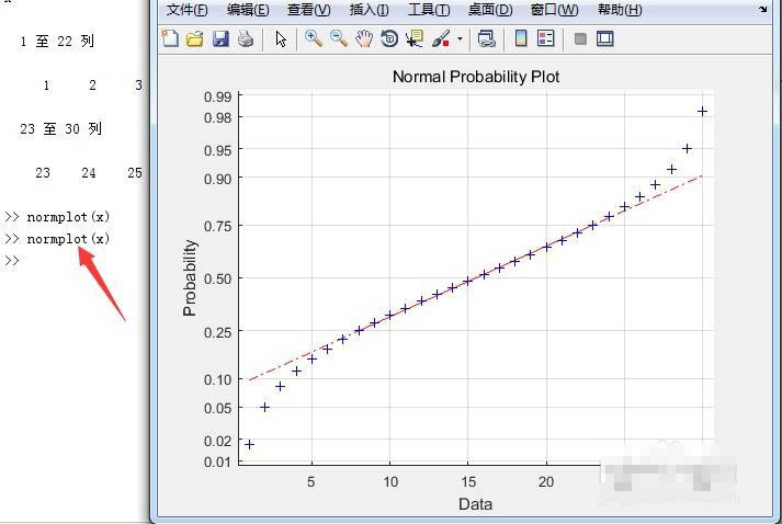 2、對它進行概率分布的可視化介紹,通過正態概率分布函數normplot,還有Q-Q圖來進行操作,如圖