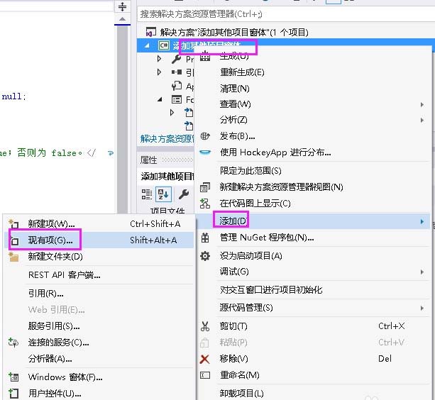 4、在解決方案中,選中項目“添加其他項目窗體”右鍵,添加現有項。
