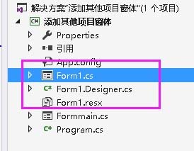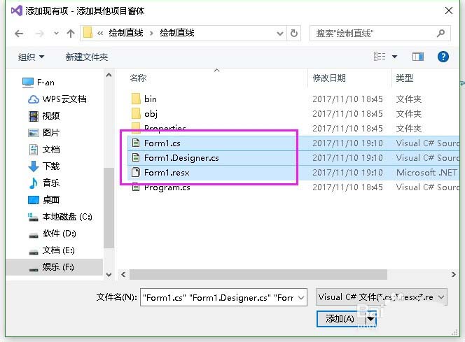 5、我找了一個我以前寫的繪制直線這個項目,將這個項目中的Form1這個窗體添加到本項目來。需要注意的是添加的文件包括窗體的設計文件和代碼文件。這里我需要將紅框選中的三個都添加上。
