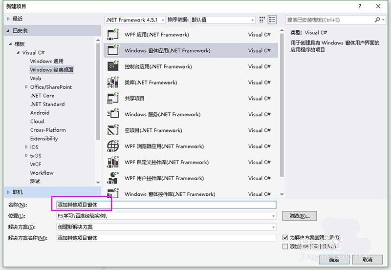 2、在新建項目界面中,選擇語言為visual C#,在Windows經典桌面下新建一個窗體應用程序,設置項目名為“添加其他項目窗體”;