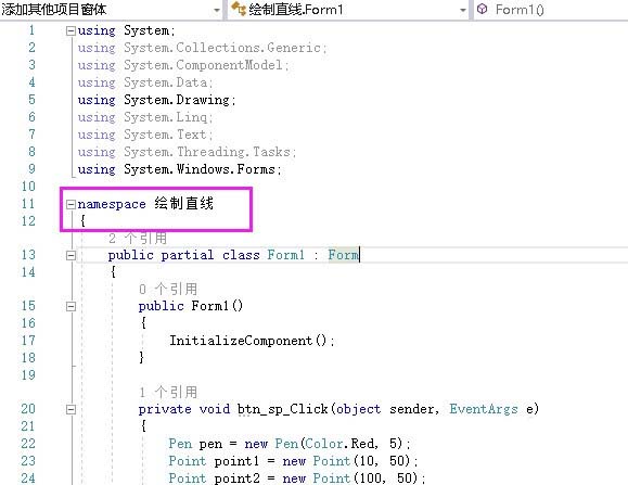 8、我們剛才添加的是“繪制直線”這個項目的form1窗體,那么我進入這個文件看看他的命名空間是“namespace 繪制直線”,和本項目不在同一命名空間下。