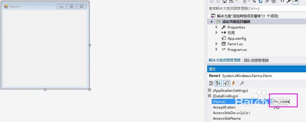 3、進入新建的項目,將窗體name屬性設置為“fm_main”,窗體類改成Formmain.cs