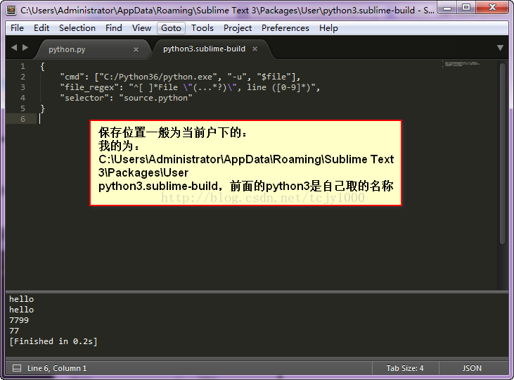 { "cmd": ["C:/Python36/python.exe", "-u", "$file"], "file_regex": "^[ ]*File /"(...*?)/", line ([0-9]*)", "selector": "source.python", "encoding": "cp936" }