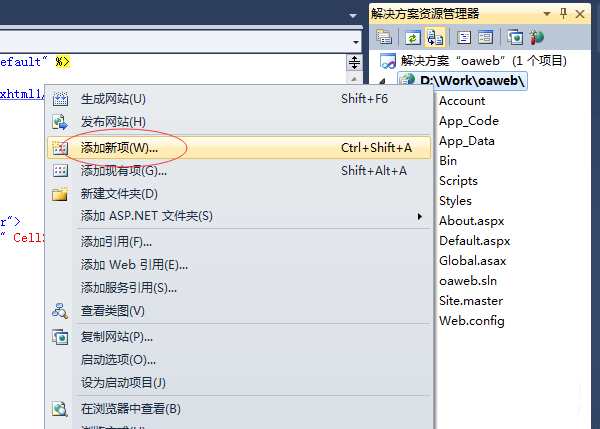 2、在右側(cè)解決方案中選擇添加一個新項,如下圖所示,或者在一個既有的頁面中增加功能也可以。