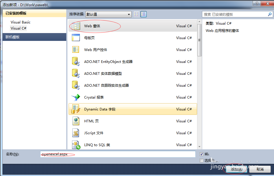 3、本文以添加一個既有的新項為例來說明,點擊添加新項后,頁面如下所示,增加一個web窗體,并為新頁面命名后點擊添加按鈕,如下截圖中標(biāo)紅所示。