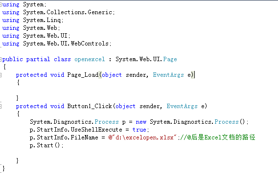 p.StartInfo.FileName = @"d:/excelopen.xlsx";//@后是Excel文檔的路徑