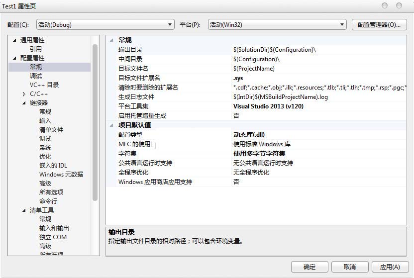 在常規(guī)選項中將目標(biāo)擴(kuò)展名改為.sys,注意配置類型為:動態(tài)庫(.dll)