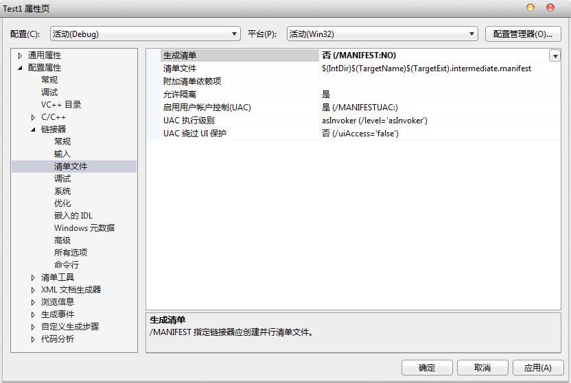 在清單設(shè)置里面將生成清單設(shè)置成:否(/MANIFEST:NO)