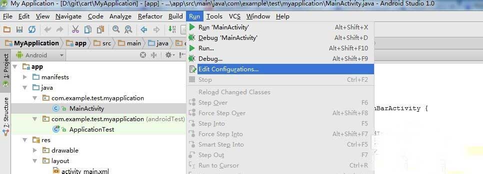 4、在MainActivity上點(diǎn)擊右鍵->"Run 'MainActivity'"。