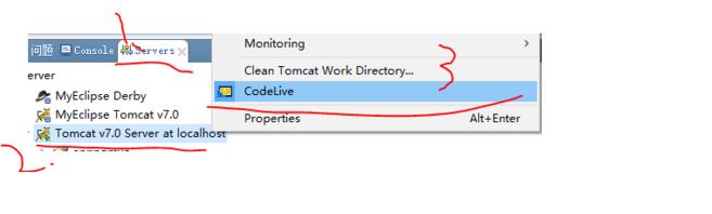 2、在Servers視圖中找到運行的服務器類型(我的是Tomcart7.0),右鍵選擇CodeLive并單擊。問題解決。。。
