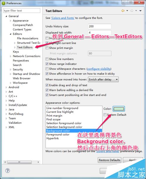 2、進入對話框后:展開General標簽,選中Editors選項,再選中 Test Editors,右邊出現Test Editors面板。 面板中有這樣一個選項:Appearance color options; 其中是各種板塊顏色的設置,其中有一項是background color,根據自己的喜好選擇顏色。 選中background color,勾掉System Default,點擊'color'顏色塊,將出現顏色選擇面板。操作如圖所示
