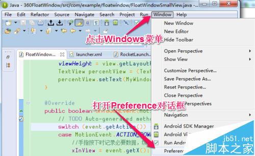 1、首先,是設置背景色的方式,打開Eclipse以后,依次點擊 Windows -> Preference。打開界面配置對話框。操作如圖所示