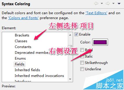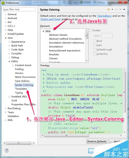1)展開Java標簽 ,展開 Editor標簽,點擊Syntax Coloring 標簽,右側彈出選項卡。