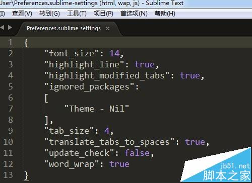 3、sublime實用的配置。打開:首選項>設置-用戶,然后可以在里面設置字體大小"font_size": 14;關閉檢測更新"update_check": false,自動換行"word_wrap": true等。