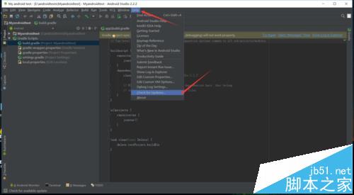2、在Android studio頁面的上方,選擇“Help——Check For Updates”單擊進行Android studio的更新檢查,等待一段時間進行文件檢查。