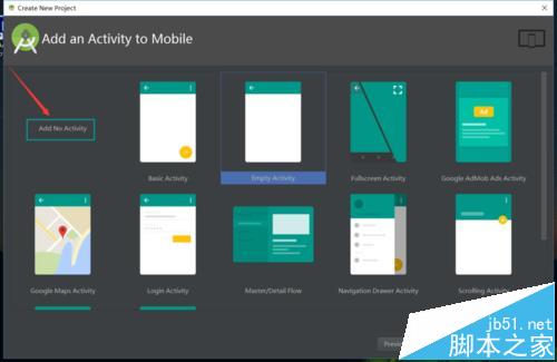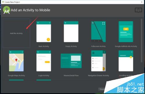 5、完成我們項目的基礎屬性后,我們會進入項目的類型選擇,Android studio給予用戶非常豐富的選擇,第一個“add no activity”,系統(tǒng)不會給予我們原始代碼。