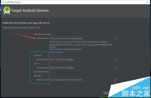 4、完成名稱的設置以及儲存路徑的設置后,點擊“Next”,進入下一步的設置,此窗口為設置我們項目的適用android系統(tǒng)版本,選擇合適的版本后點擊“Next”。