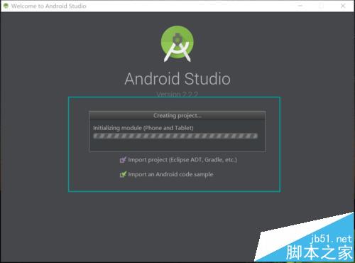 7、選擇模版后,點擊“Finish”完成所有屬性的設置,開始進行新建項目的組建,Android studio會回到初始頁面,并開始新建的進程。