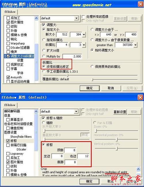 關于畫面縮放請參見我中高級教程里的相關部分,ffdshow的這個慮鏡解決了如果用壓縮軟件來縮小畫面會極度增加壓縮時間的不利因素