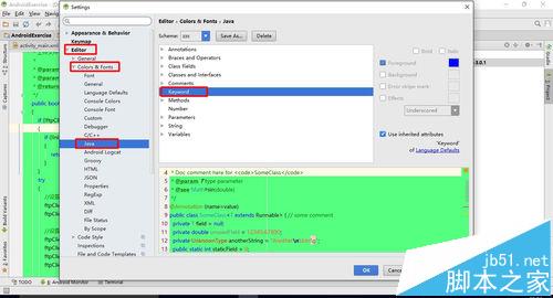2、在【Settings】窗體中依次點(diǎn)擊【Editor】——【Colors&Fonts】——【Java】,在右側(cè)的界面中點(diǎn)擊【Keyword】,在這里可以統(tǒng)一設(shè)置代碼中所有關(guān)鍵字的顏色。