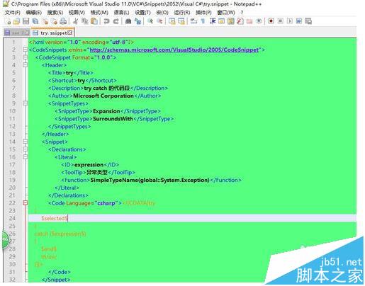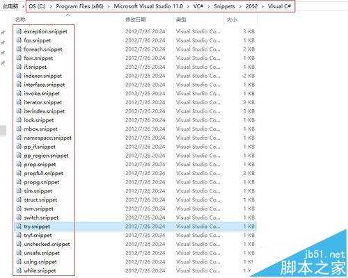 4、另外,我們還可以自定義一些我們常用的代碼段,例如我們可以復制一個已有的snippet文件到Visual C#文件夾中,然后修改為我們所需要的代碼段并重命名(假設命名為zzc),那么我們以后就可以在編寫代碼的時候只需要輸入”zzc”,然后按兩下Tab鍵,則可將我們自定義的代碼段添加到編輯器中,十分方便。