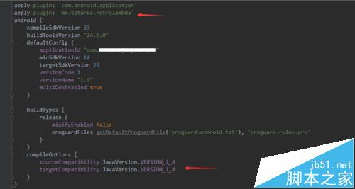 2、Gradle(Module)中添加apply:apply plugin: 'me.tatarka.retrolambda'。Java版本:compileOptions { sourceCompatibility JavaVersion.VERSION_1_8 targetCompatibility JavaVersion.VERSION_1_8}