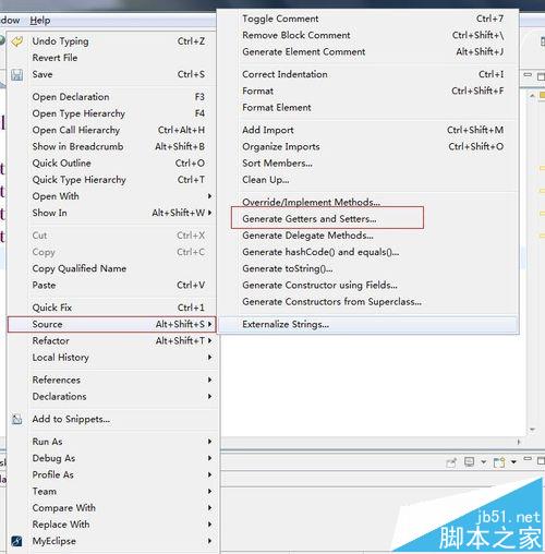 4、鼠標右擊,彈出菜單選擇source后顯示二級菜單中選擇Generate Getter And Setter