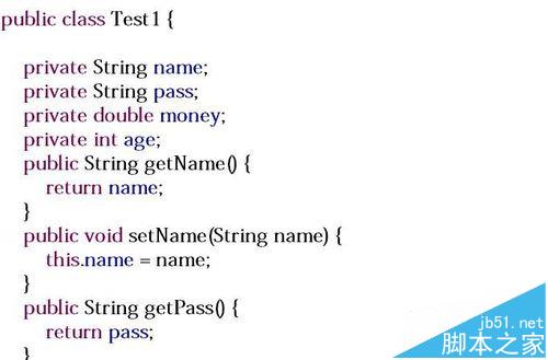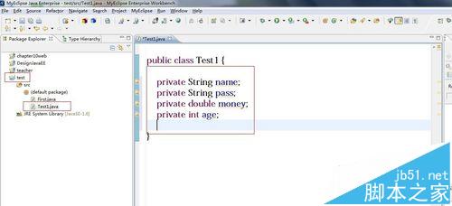 2、創建工程,Java文件,在文件中編寫屬性,我這里是Test工程,test1的Java文件,屬性有name,pass,money和age屬性