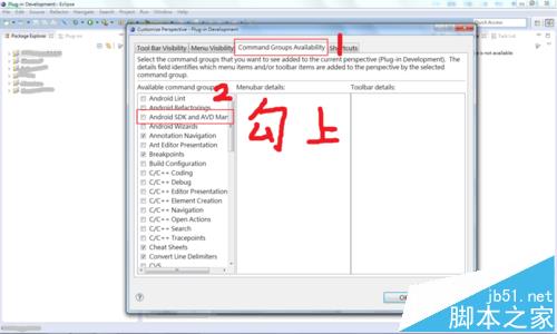 3、Command Groups Availability > Android and AVD Manager > check (勾選)