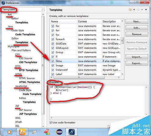5、找到Java 模板(Templates):單擊菜單欄中的"Windows-Preferences"。會彈出”Preferences"對話框,在“搜索項”里輸入“templates",會自動列出MyEclipse的各種模板(JAVA.CSS.DTD.HTML.JavaScript.JSP.Java注釋模板(僅供參考))。這里僅做個示范。還可以在”Preferences"對話框,單擊-Java-Editor-Templates,跟上面的效果一樣。