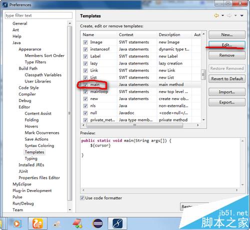 6、更改Java模板:在”Preferences"對話框中找到自己想要更改的標簽名稱,例圖中的”main”方法,單擊“Edit"按鈕.