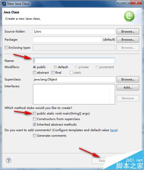 4、創建類的名稱:在彈出的“New Java Class"對話框中,找到”Name:"標簽,在后面的文本框中輸入自定義的名稱,例如圖中的"a".其它默認.也可以勾選“public static void main(String[] args)選項卡,可以生成main()方法。單擊"Finish"即可。