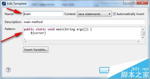 7、更改Java模板2:在彈出的“Edit Template"對話框,找到”Pattern"標簽,在文本庫中可以更改成自定義的樣子。