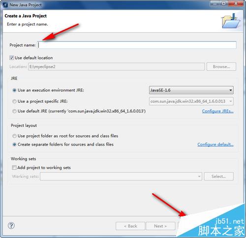 2、創建Java項目名字:在彈出的"New Java Project"對話框中,找到“Prooject name:"標簽,在后面輸入一個自定義的名稱。其它默認,單擊"Finish”。