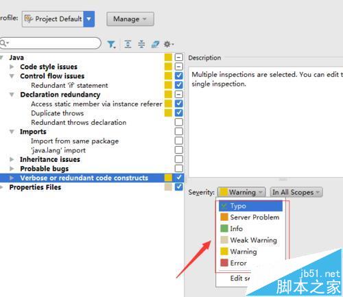 5、并進行設(shè)置檢查的安全的級別,進行點擊severity的選項菜單中的,進行選擇需要的檢查的顏色提示。