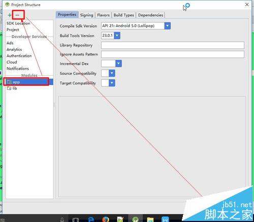 4、在Project Structure窗體中可以看到左側的Module區域,其中列出了工程所有的Module,選中要刪除的Module,然后點擊左上角的減號按鈕,最后點擊OK按鈕。
