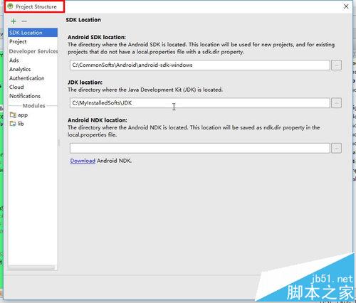 3、然后打開工程的組織管理窗體:Project Structure。可以通過File——Project Structure打開,也可以通過點擊工具欄中的“Project Structure”按鈕打開,打開的界面如圖所示。
