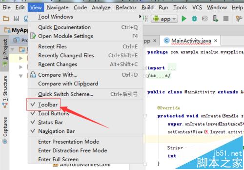 2、進行點擊android studio菜單中的view的選項,然后彈出了下拉菜單中進行選擇為“Toolbar”的選項。