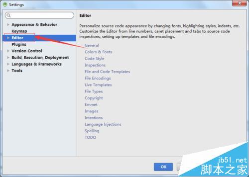 2、進入到了settings的選項框中,進行選中列表中的editor的選項。