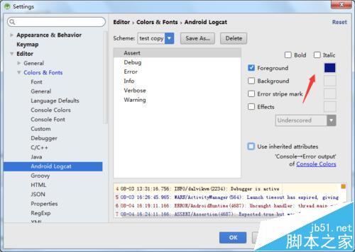 8、可以看到assert在logcat預覽中顯示為深藍的顏色。其它設置的設置也是類似。
