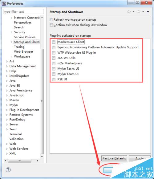4、如果只進行J2EE的web項目開發,可以嘗試將所有勾選去掉。然后點擊【OK】按鈕進行保存,最后重新啟動eclipse。