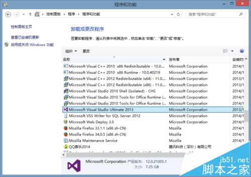 1、打開"控制面板"->"程序"->"程序和功能"(我是windows8.1,其他版本的系統類似),找到vs2013,右鍵,選擇“更改”