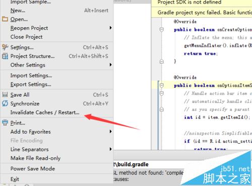 4、彈出的下拉菜單中可以看到為“invalidate caches/restart”的選項,點擊進入即可。